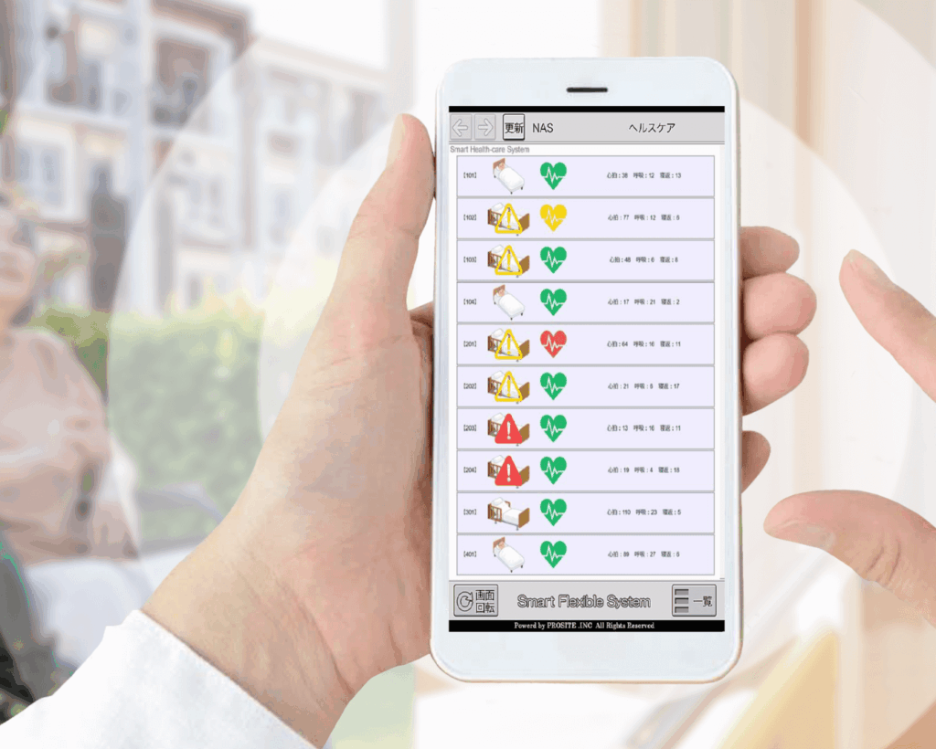 - 巡回中、いつ起こるかわからない介護対象者の異常に気付けないと、大きな惨事につながります。そこで、警告・異常をスマホへのプッシュ通知でスタッフ全員へお知らせします。