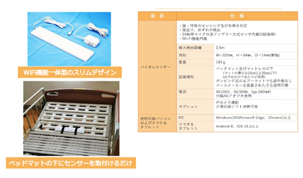- 本システムは、非接触バイタル感知センサー(24GHzマイクロ波を使用したドップラーセンサー)を使用することにより、介護対象者ご本人への身体的負担ゼロを実現しました。