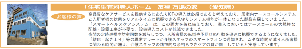 - 介護関連の情報サイト「レバウェル介護」(運営:レバレジーズ様)で、「心に寄り添うテクノロジー!負担を減らし、ケアの質を高める組織」の一社として、当社の【スマートヘルスケアシステム SHcS(Smart Health-care System)】をご紹介いただきました。